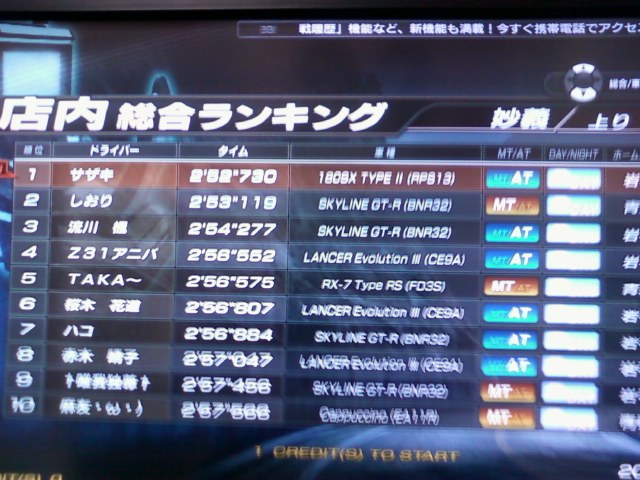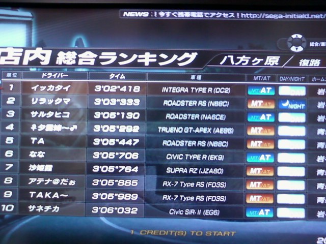 赤城上り(379回)、八方復路(273回)、筑波復路(197回)、いろは下り(186回)、秋名下り(120回)、赤城下り(118回)、妙義下り (86回)、筑波往路(83回)、長尾下り(75回)、妙義上り(68回)、八方往路(59回)、いろは逆走(53回)、長尾上り(51回)、秋名湖右 (40回)、秋名上り(33回)、秋名湖左(32回)、ネットワークエラーによるデータ欠損(1回<八方復路>)